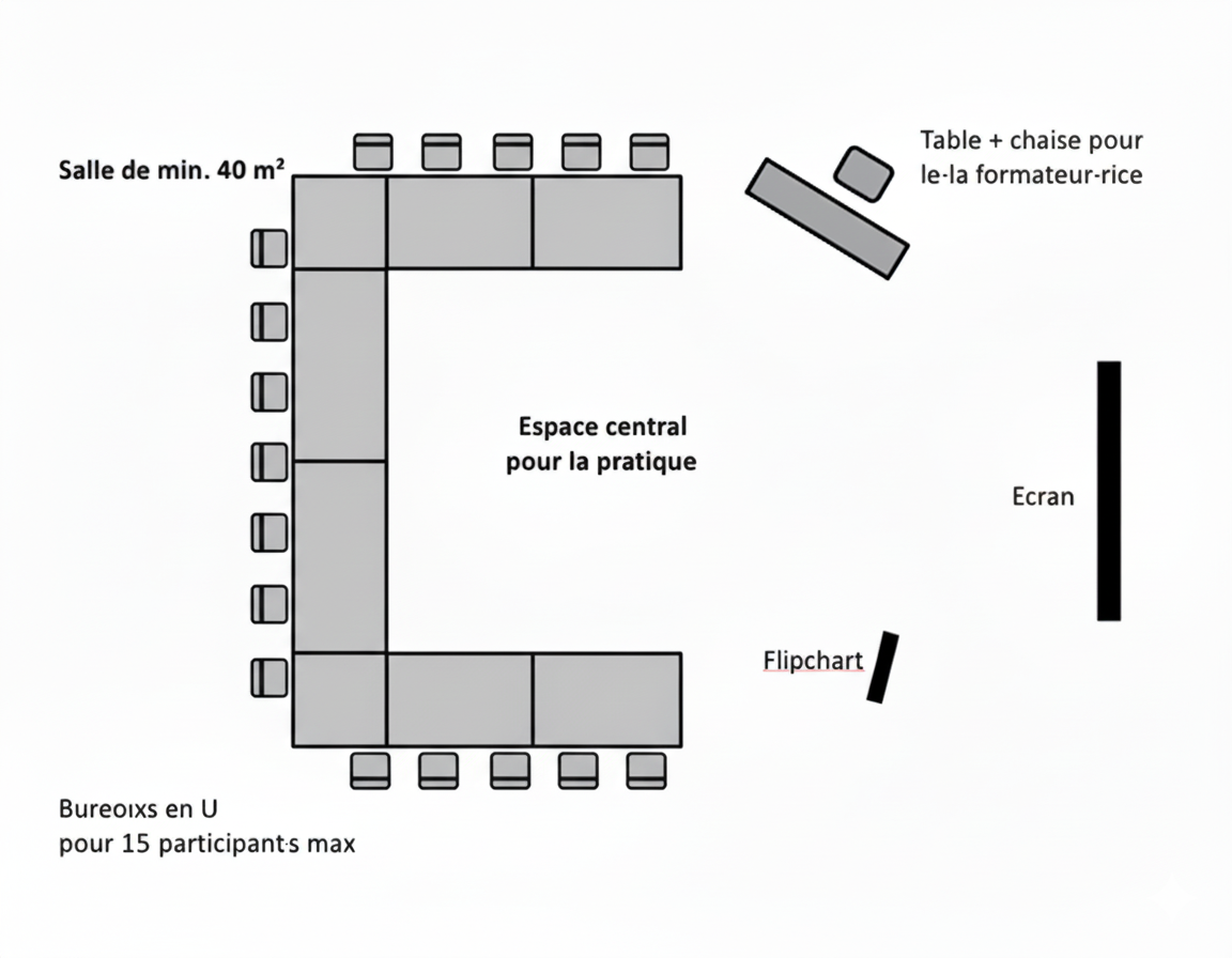 - Mise en place : Pour un démarrage ponctuel, nous vous remercions de préparer la salle avant l’arrivée de notre formateur/formatrice (chaises en arc de cercle, table pour le formateur, etc.).